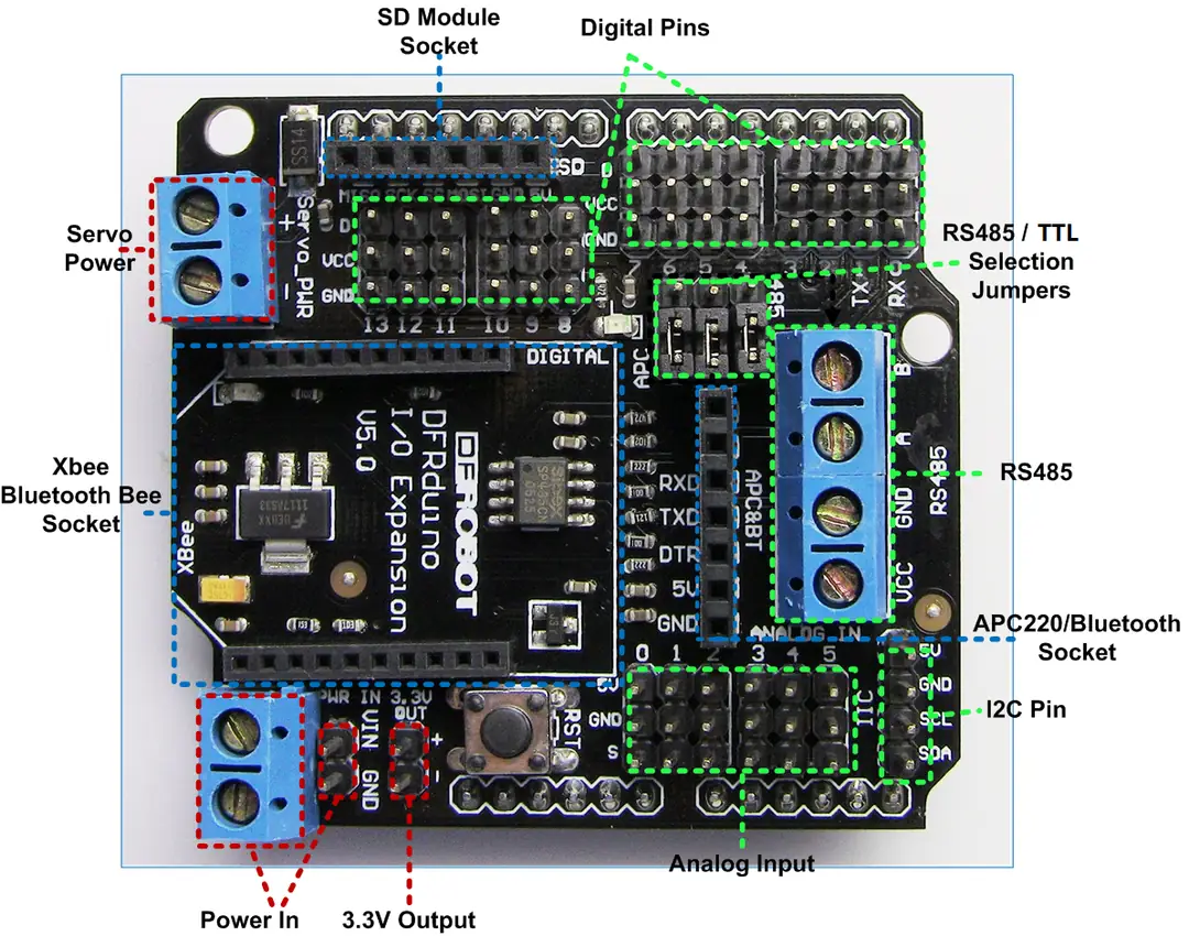 The Arduino XBee and IO Expansion Shield is an IO expansion board designed to simplify connecting modules such as XBee, Bluetooth, RS485, as well as various sensors and input/output components to your Arduino.