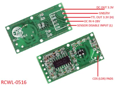 - R-CDS: Enables light-dependent control (can disable detection in daylight using an LDR)